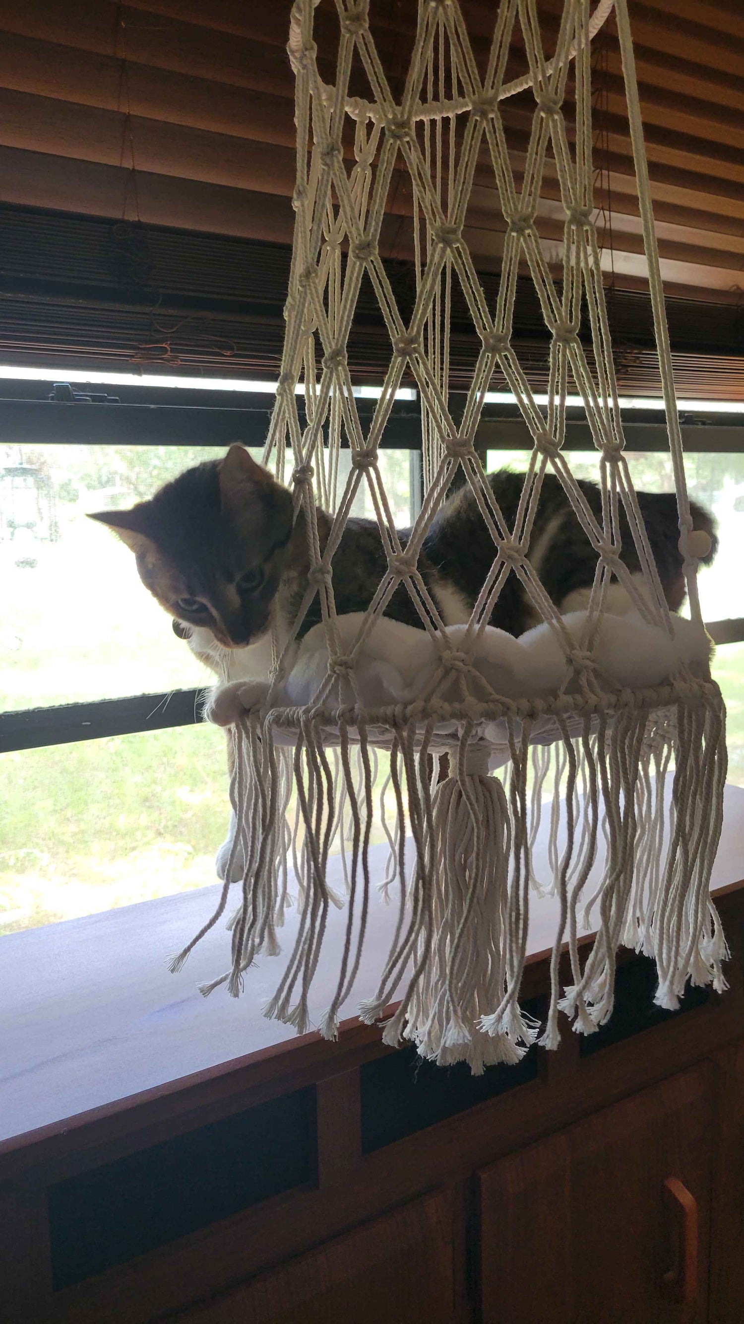 "My cat absolutely adores this hammock! She looks so relaxed and stylish lounging in it."