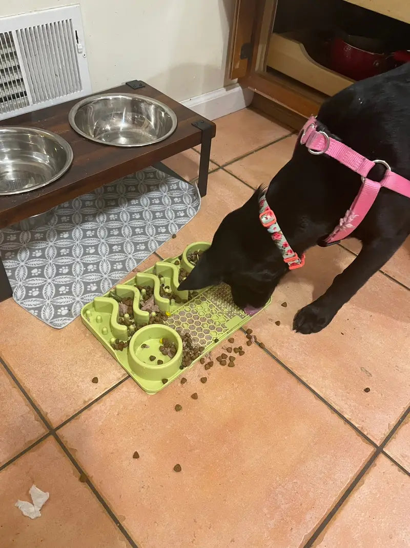 "I gotta say, this feeding mat for my big pup is really good quality. It feels sturdy and well-made, and I don't have to worry about him tearing it up or anything. Plus, it actually works - his eating has slowed down a lot since we started using it. And cleaning it is a piece of cake, which is a huge plus for me. I'd definitely recommend this to anyone with a big dog who wants to make mealtime better."